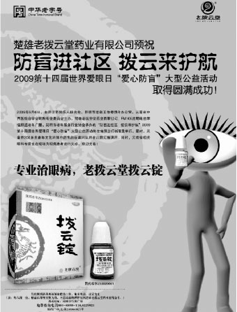 2009年6月6日,由昆明市残疾人联合会、昆明市老龄工作委员会办公室、云南省中西医结合学会眼科专业委员会主办,楚雄老拨云堂药业有限公司、 FM105昆明电台幸福频道老年广播、昆明市老年服务行业协会承办的“防盲进社区 拨云来护航”2009第十四届世界爱眼日“爱心防盲”大型公益活动将在南屏步行街隆重举行。届时,从全市200多支老年文艺团体中胜出的获奖团队将在此做汇报演出。同时,云南省相关眼科专家也在现场为眼病患者进行义诊。