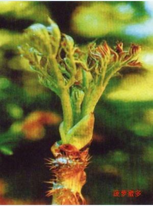 刺嫩芽又叫刺龙芽,主要生长在灌木丛中和林中空地。它不像其他野菜一样属于草本植物,而是木本植物。它的树皮呈灰色,上面生满了粗大坚硬的皮刺;花是淡黄白色;果子是浆果,球形、黑色。