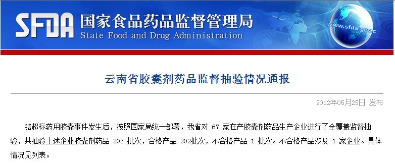 同时,5月26号凌晨,国家药监局发布了全国清查胶囊剂药品金属铬含量抽检结果:共254家企业存在生产铬超标药品问题,占全部胶囊剂药品生产企业的12.7%;在云南省区域中,我公司产品全部合格。