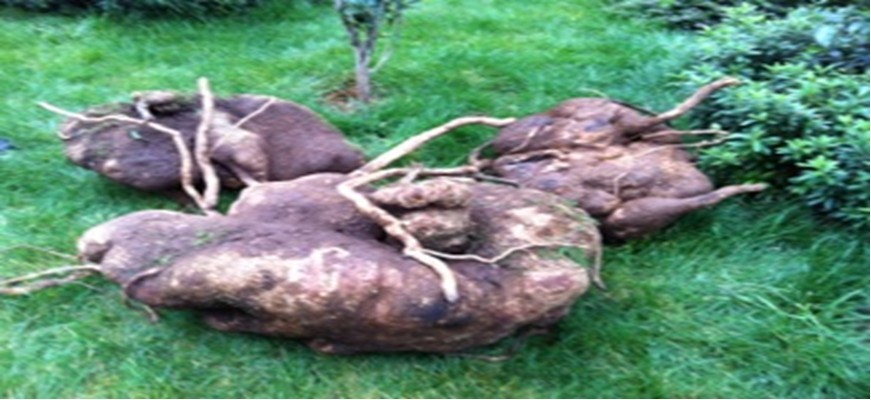 据医书记载,“锣锅底”中文名“赛金刚”,别名“曲莲”,俗称“地乌龟”。多年生草质、攀援藤本。块茎扁球形盆状。茎细长,具棱,卷须与叶对生。叶互生,具柄;叶片叉指状,小叶7~9,披针形,中间小叶最大,长6~10厘米,宽1.5~3厘米,生于山坡、竹林阴湿处,分布我国西南地区。其根茎一般只有土豆大小,是中医用于消炎和肿瘤治疗的珍贵药材。而此次发现的“锣锅底”,根茎最大的约100多公斤,最小的也近50多公斤。实际测量结果:最大一株根茎长107cm,宽80cm,高60cm;次之长80cm、宽70cm、高60cm;最小一株根茎长75cm、宽70cm、高40cm。其生长时间估算已有300年之久。